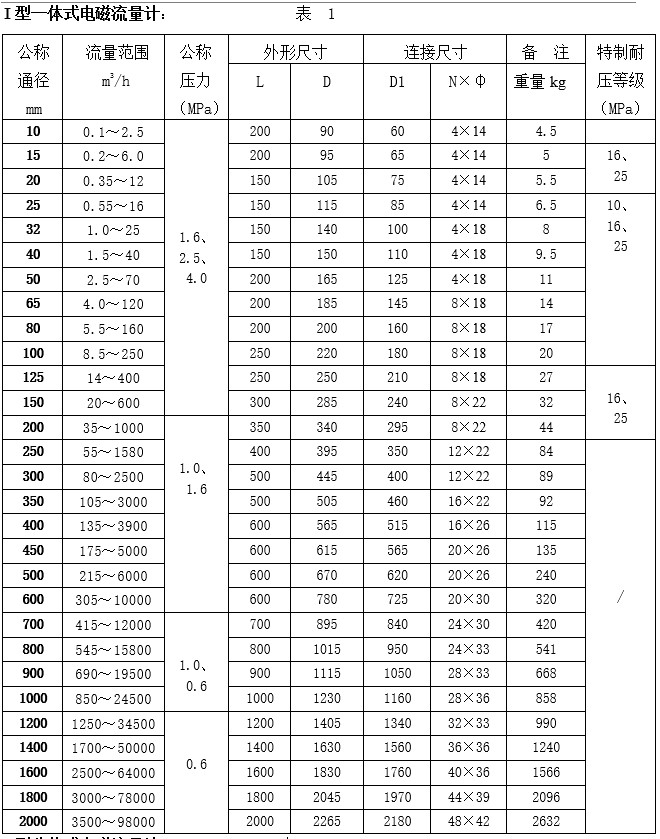 I型一體式電磁流量計口徑DN(mm): 10、15、20、25、32、40、50、65、80、