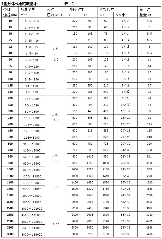 I型分體式電磁流量計口徑DN(mm): 10、15、20、25、32、40、50、65、80、