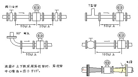 直管段長(cháng)度為了保證電磁流量計的測量準確度和穩定性,流量計安裝位置上下游應滿(mǎn)足下圖所示的管路條件。