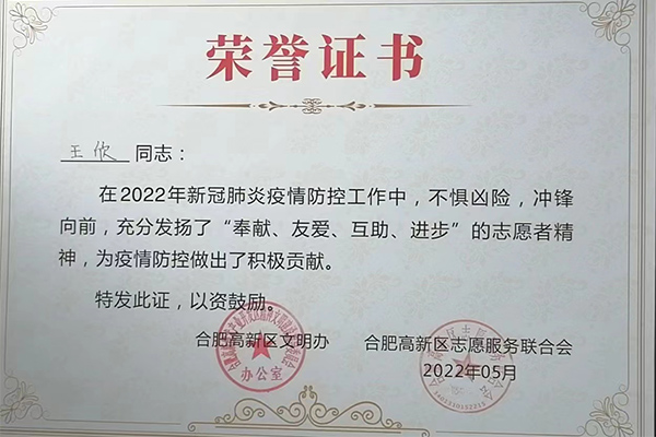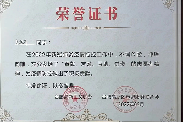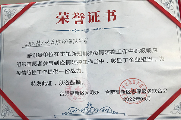 合肥精大儀表股份有限公司在新冠肺炎疫情防控工作中積極響應,組織志愿者參與到疫情防控工作中,彰顯了企業(yè)擔當,為疫情防控工作提供一份戰力。黨員王欣、吳淑芹二位同志在2022年新冠肺炎疫情防控工作中,不懼兇險,沖鋒向前,充分發(fā)揚了“奉獻、友愛(ài)、互助、進(jìn)步”的志愿者精神,為疫情防控做了了積極的貢獻。公司和個(gè)人被高新區文明辦、和高新區志愿服務(wù)聯(lián)合會(huì )授予此榮譽(yù)證書(shū)。