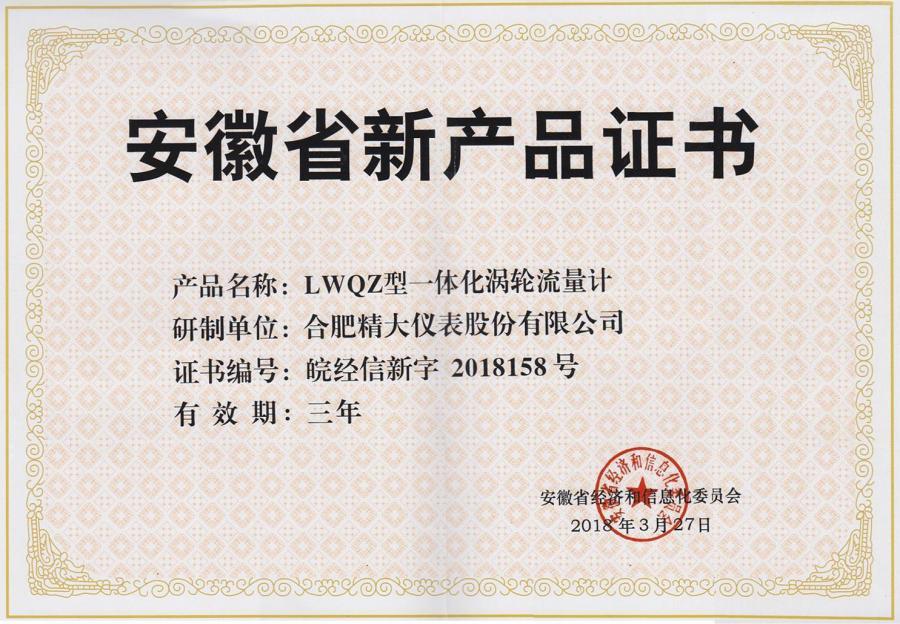 安徽省新產(chǎn)品證書(shū)(LWQZ型)